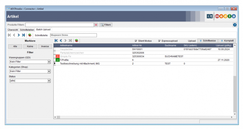 Der Reiter Batch Upload können Sie mehrere Artikel auf einmal zu den Plattformen übertragen. Dabei markieren Sie alle Artikel die Sie übertragen wollen (mehrfach mit der Strg Taste) und wählen den Schrittweisen oder den Kompletten Upload. Beim Schrittweisen Upload werden die Artikel eines nach dem anderen hochgeladen, wobei beim kompletten Upload alle Artikel in einer Anfrage verarbeitet werden. Beachten Sie, dass letzteres zu einem zeitweiligen „einfrieren“ der GDI führen kann. Mit Expressupload können Sie einen reduzierten Teil der Artikeldaten übertragen (wie zum Beispiel nur Lagerwert). Welche Daten dies genau sind, können Sie in den Einstellungen festlegen.