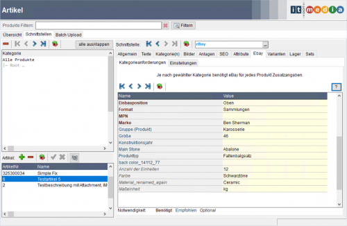 Nachdem Sie die Kategorieanforderungen gewählt und mit Okay bestätigt haben, können Sie unter dem neuen Reiter Ebay → Kategorieanforderungen diese Felder mit Werten füllen: