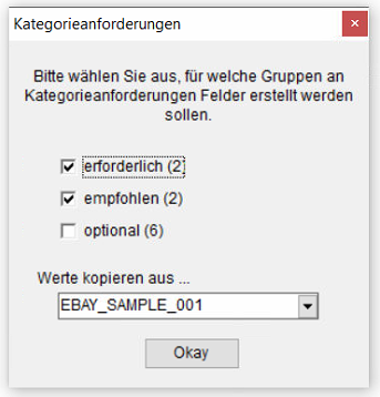 Bei den Ebay Kategorien gibt es für jede Kategorie spezifisch optionale, empfohlene und/oder Pflichtfelder. Aus diesem Grund wird Ihnen nach der Auswahl einer Kategorie folgendes Dialogfenster angezeigt: