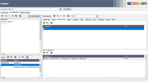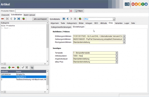 Um einen Artikel bei Ebay einzustellen werden zusätzliche Angaben für jeden Artikel benötigt. Aus diesem Grund sehen Sie einen etwas veränderten Reiter „Kategorien“ und einen neuen Reiter „Ebay“.