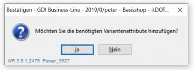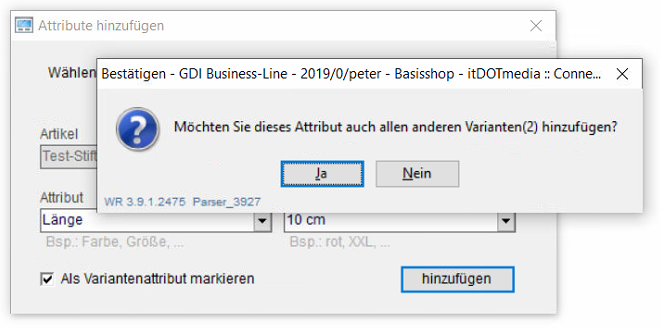 Ebenso erhalten Sie nun beim Hinzufügen neuer Varianten eine Abfrage, ob Sie diesem Artikel die benötigten Attribute hinzufügen möchten.