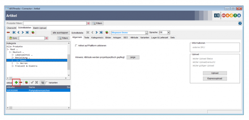 Im Reiter Allgemein können Sie Artikel auf der jeweiligen Plattform aktivieren bzw. deaktivieren sowie in die jeweilige Plattform übertragen. Über den Button Expressupload kann ein „schneller“ Upload angestoßen werden (zum Beispiel zur Aktualisierung des Lagerwertes). In den Einstellungen geben Sie an, welche Felder bei einem Expressupload übertragen werden sollen.