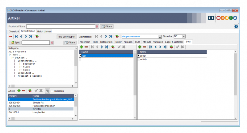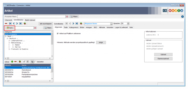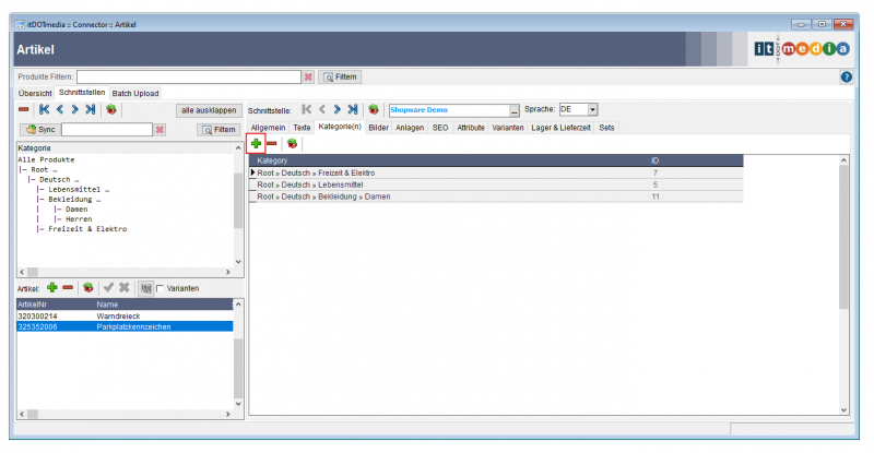 Der Abschnitt Schnittstelle dient zum Durchschalten der jeweiligen Plattform, sollten Sie mehr als eine Schnittstelle verwenden. Links sehen Sie (wie auch in allen folgenden Reitern) den Kategoriebaum (der jeweiligen Schnittstelle) und die dazugehörigen Artikel. Die Kategorien werden über „Synch“ über dem Kategorie-Fenster, aus dem Shopsystem importiert. Außerdem werden die Kategorien beim Speichern über Einstellungen mit abgerufen. Um eine Kategorie zu expandieren, führen Sie einen Doppelklick auf deren Namen aus. Alle Produkte zeigt dabei alle Produkte an, die bereits der jeweiligen Schnittstelle hinzugefügt wurden.