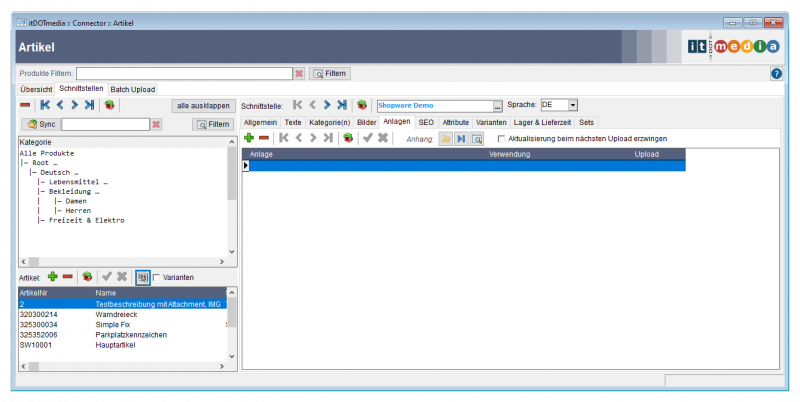 Im Reiter Anlagen finden Sie alle Artikelanlagen, welche Sie in den Stammdaten des Artikels angegeben haben. Unter Verwendung geben Sie an, welche Verwendung auf der Plattform dafür vorgesehen ist. Beachten Sie, dass nicht jede Plattform jede Verwendung unterstützt. Um eine Anlage hinzuzufügen, verwenden Sie bitte die Artikelpflege in der GDI: