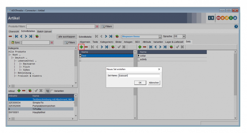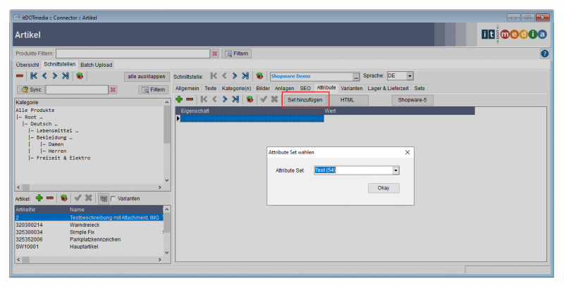 Oft wiederholen sich die Attributeigenschaften mehrerer Artikel. Daher können Sie Sets erstellen und über „Set hinzufügen“ gleich mehrere Eigenschaften auf einmal vorbelegen. Sie müssen dann nur noch die richtigen Werte angeben.