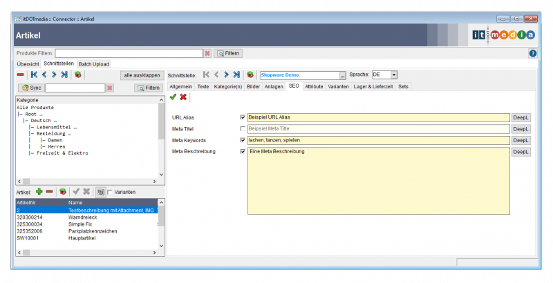 Im Reiter Texte kann der Artikelname und/oder die Artikelbeschreibung überschreiben werden. Sind die jeweiligen Haken nicht gesetzt, wird der Artikelname bzw. die Beschreibung aus den Artikel-Stammdaten verwendet. Außerdem ist es möglich einen externen HTML-Editor zu verwenden. Zudem kann mithilfe des „DeepL“-Buttons der eingefügte Text schnell und unkompliziert übersetzt werden, zum Beispiel wenn die Sprache über das Dropdown-Menü geändert wird.