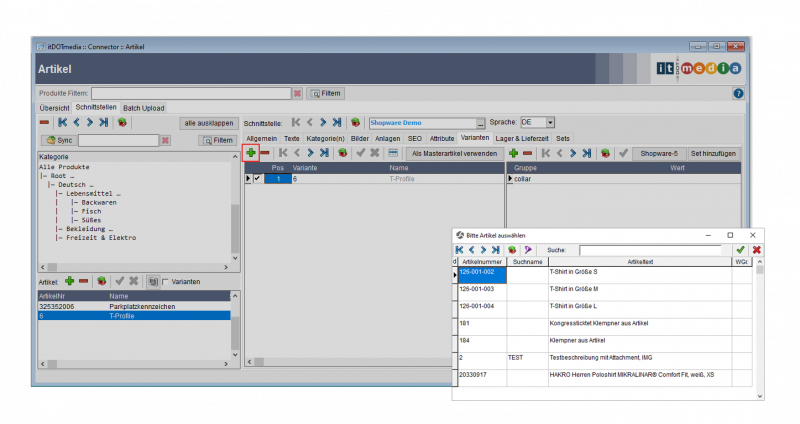 Um einen neuen Artikel aus der GDI einer Schnittstelle hinzuzufügen, wählen Sie die entsprechende Kategorie und im Anschluss über die + Schaltfläche den Artikel. Mit - können Sie den aktuell gewählten Artikel wieder entfernen.