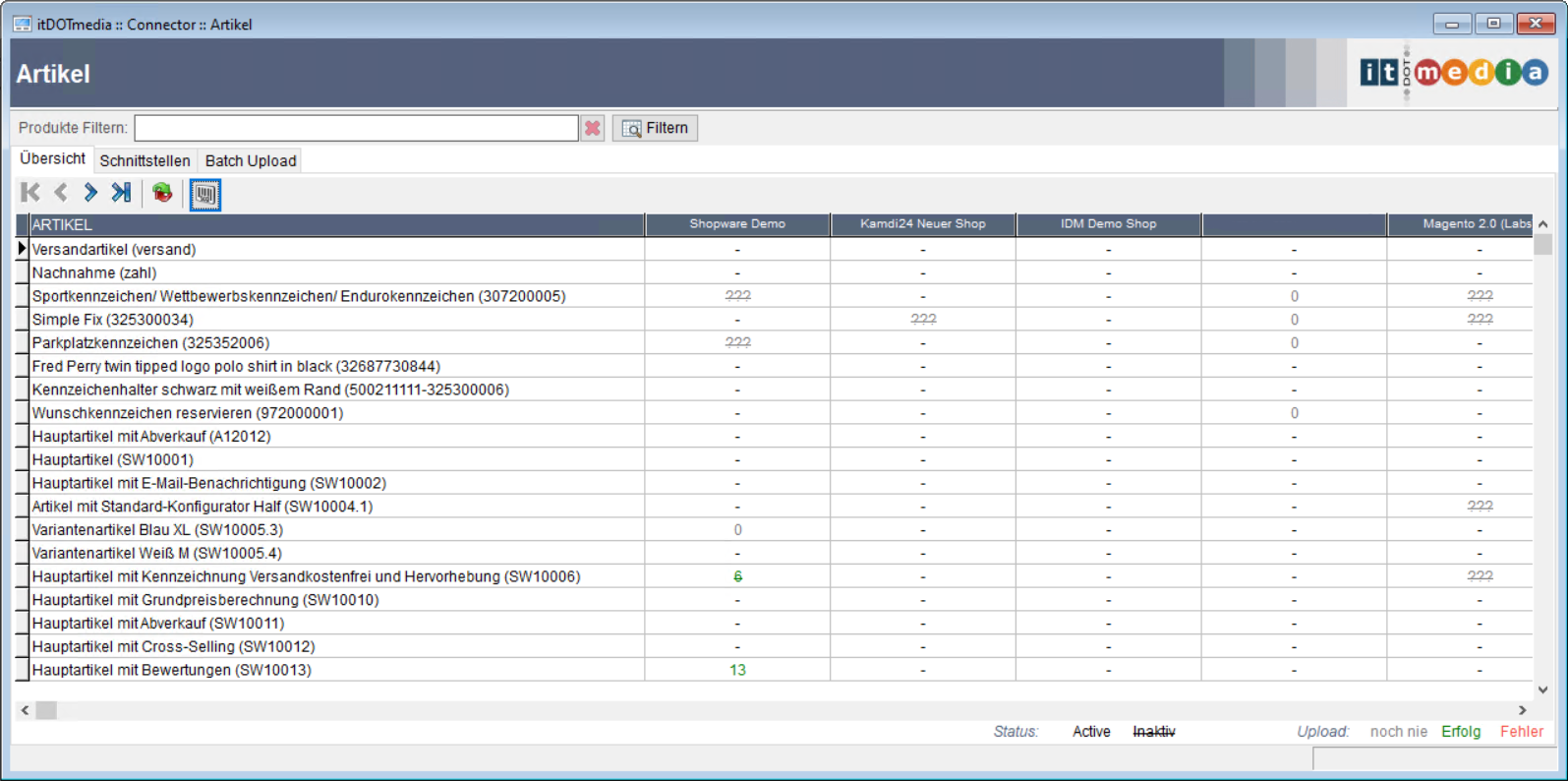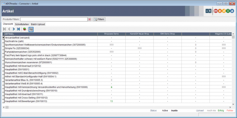 Auf der Übersichtsseite sehen sie, welche Produkte auf welcher Plattform übertragen wurden. Die Filterfunktion erlaubt es Ihnen, nur Produkte mit einer bestimmten Artikelnummer oder einem bestimmten Artikelnamen, anzuzeigen.