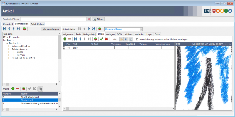 Der Reiter Bilder dient zum Verwalten der Bilder zu einem Produkt. Um ein neues Bild hinzuzufügen, klicken Sie zuerst den + Button und führen Sie dann einen Doppelklick auf das Vorschaubild aus. Mit - können Sie eine Verknüpfung wieder löschen.