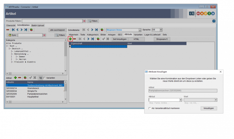 Im Reiter Attribute werden die Attribute eines Artikels gepflegt. Ein Beispiel wäre die Farbe oder die Größe eines Artikels. Über den Button + können Attribute zu einem Artikel hinzugefügt werden.