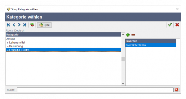 Hier können Sie eine weitere Kategorie auswählen. Per Doppelklick auf einen Kategorienamen, wird in diese Kategorien gewechselt und es erscheinen alle Unterkategorien. Sync ruft die Kategorien von der aktuellen Plattform erneut ab. Dies ist nur nötig, wenn Sie auf der Plattform neue Kategorien erstellt haben und es noch keinen Abruf über die Einstellungsmaske gab. Über die Suche können Sie nach einer Kategorie anhand deren Namen suchen. Sie können Kategorien auch favorisieren, indem Sie auf die gewünschte Kategorie und dann auf das +, über dem Favoriten-Fenster, klicken. Ein Klick auf den grünen Haken übernimmt Ihre Auswahl und schließt den Dialog.