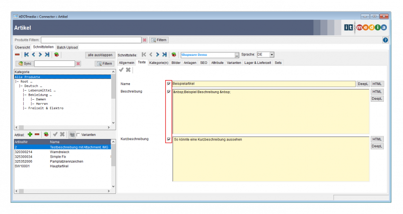 Im Reiter Texte kann der Artikelname und/oder die Artikelbeschreibung überschreiben werden. Sind die jeweiligen Haken nicht gesetzt, wird der Artikelname bzw. die Beschreibung aus den Artikel-Stammdaten verwendet. Außerdem ist es möglich einen externen HTML-Editor zu verwenden. Zudem kann mithilfe des „DeepL“-Buttons der eingefügte Text schnell und unkompliziert übersetzt werden, zum Beispiel wenn die Sprache über das Dropdown-Menü geändert wird.