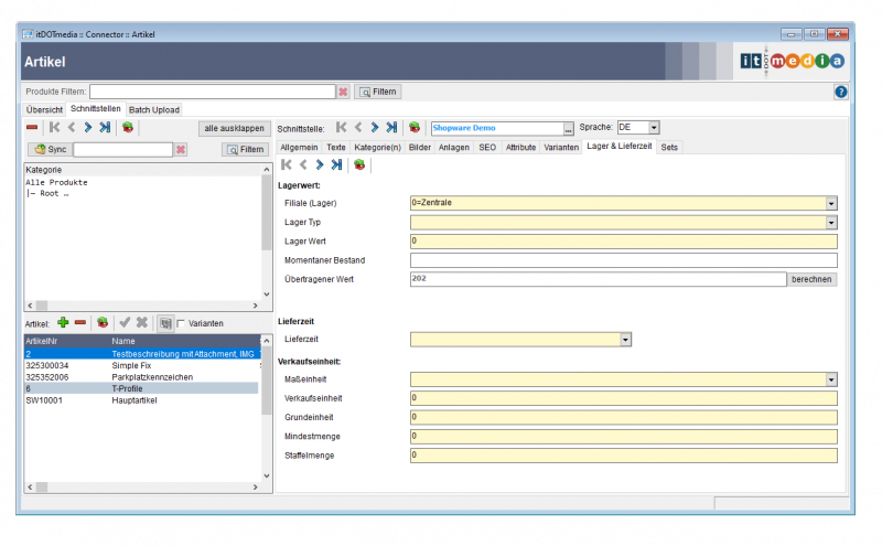 Es kann die Lieferzeit sowie die Verkaufseinheit hinterlegt werden. Die Maßeinheiten werden aus dem Shop gezogen