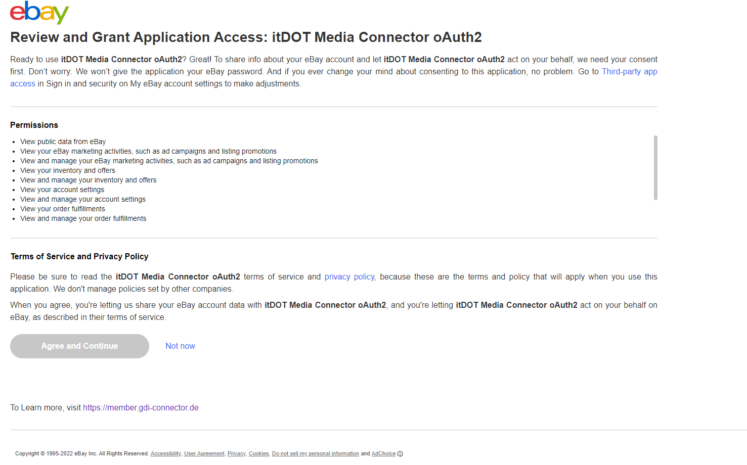 Um Daten von Ihrem eBay Account abzurufen, ist es notwendig, dass Sie den GDI-Connector in Ihrem Account die notwendigen Rechte einräumen. Hierzu wird die aktuell empfohlenen Authentifizierung über oAUTH genutzt.
